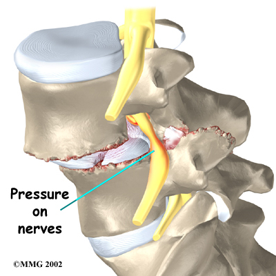 Slippage can also cause nerve compression. Nerve compression is a result of . As the spine slips forward, the nerves may be squeezed where they exit the spine. This condition also reduces space in the spinal canal where the vertebra has slipped. This can put extra pressure on the nerve tissues inside the canal. Nerve compression can cause symptoms where the nerve travels and may include numbness, tingling, slowed reflexes, and muscle weakness in the legs.