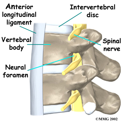 Since the surgeon needs to reach the front of the spine, this operation is done through the abdomen. The main structures involved in this procedure are the vertebral bodies and the intervertebral discs. The vertebral bodies are the large blocks of bone that make up the front section of each vertebra. The intervertebral discs are the cushions between each pair of vertebrae. The fusion cages help separate the vertebral bodies, taking pressure off the spinal nerves where they travel from the spinal canal through openings called the neural foramen.