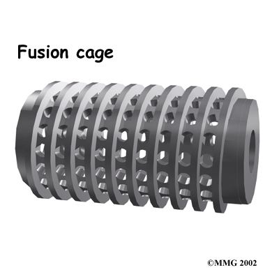 Fusion cages are most commonly made of metal, graphite, or bone. Many of these cages are shaped like cylinders. A few are rectangular in shape. They are usually threaded like a screw on the outside and hollow on the inside. The main purpose of the cage, regardless of the shape or material, is to hold the two vertebrae apart while the fusion becomes solid.