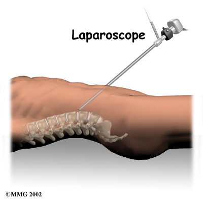 Traditionally, this operation requires a sizeable abdominal incision. Recently, however, surgeons have begun using a laparoscope in this operation. A laparoscope is a small television camera that lets the surgeon see inside the abdominal cavity to perform the operation. Several much smaller abdominal incisions are needed in the laparoscopic method. The smaller incisions allow patients to begin moving sooner and healing faster. However, performing anterior lumbar fusion with a laparoscope is difficult. It isn't the right choice for all fusion surgeries.