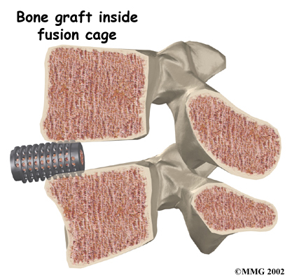 The surgeon packs the hollow center of the cage with bone. The graft is commonly taken from another part of the body, usually the top of the pelvis bone. Bone taken from another part of your own body is called an autograft. There is a risk of pain, infection, or weakness in the area where the graft is taken.
