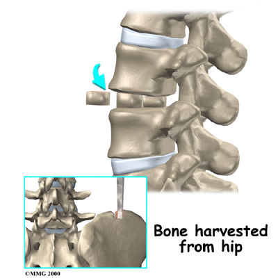 Fusion surgery requires bone to be grafted into the spinal column. The graft is commonly taken from the top rim of the pelvis. There is a risk of having pain, infection, or weakness in the area where the graft is taken.