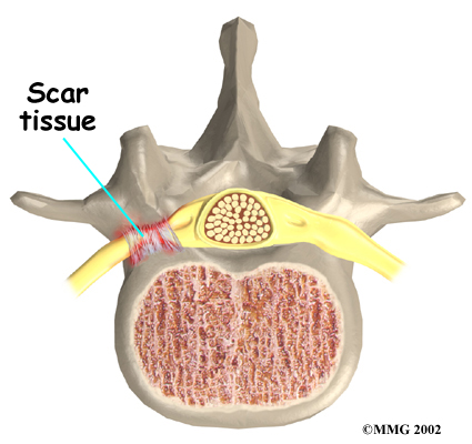 Any surgery that is done near the spinal canal can potentially cause injury to the spinal cord or spinal nerves. Injury can occur from bumping or cutting the nerve tissue with a surgical instrument, from swelling around the nerve, or from the formation of scar tissue. An injury to the spinal cord or spinal nerves can cause muscle weakness and a loss of sensation to the areas supplied by the nerve.