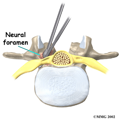 The graft creates a solid spacer to separate and hold the vertebrae apart. Enlarging the space between the vertebrae widens the opening of the neural foramina, taking pressure off the spinal nerves that pass through these openings. Also, the long ligaments that run up and down inside the spinal canal are pulled taut so they don't buckle into the spinal canal.