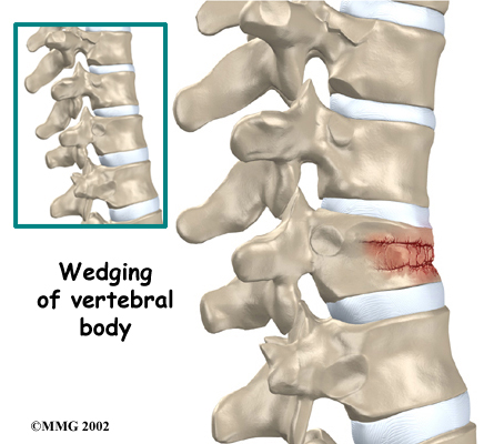 The main section of each spine vertebra is a large, round structure called a vertebral body. Compression fractures cause the front portion of this round bone to collapse in height. Because the back section of the bone stays intact, the damaged vertebral body becomes wedge-shaped. It is this wedge shape that angles the spine forward into kyphosis. The vertebral body is the main structure treated in the kyphoplasty procedure.