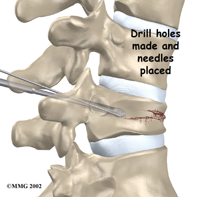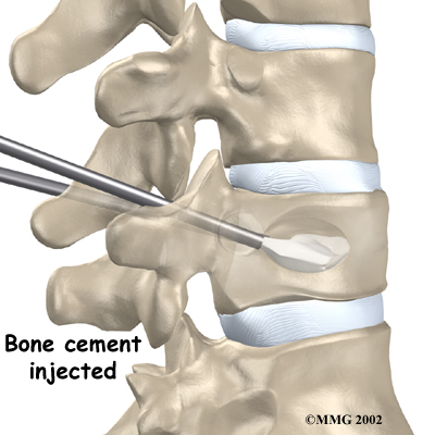 Two small openings are made in the skin on each side of the spinal column. Long needles are inserted through the openings. The needles are passed completely through the back of the spinal column into the fractured vertebral body. These needles serve as guides while the surgeon drills two holes into the vertebral body. The surgeon uses a fluoroscope to make sure the needles and drill holes are placed in the right spot. A fluoroscope is a special X-ray television that allows the surgeon to see your spine on a screen.