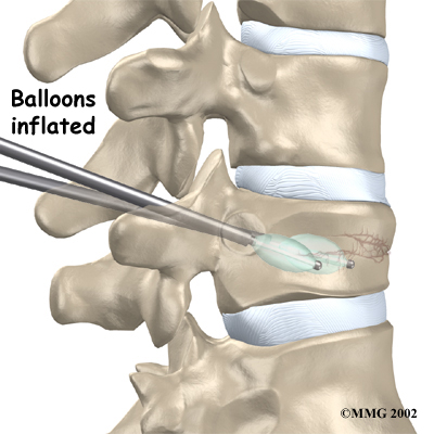 A hollow tube with a deflated balloon on the end is then slid through each drill hole. The balloons are inflated with air. This restores the height of the vertebral body and corrects the kyphosis deformity.