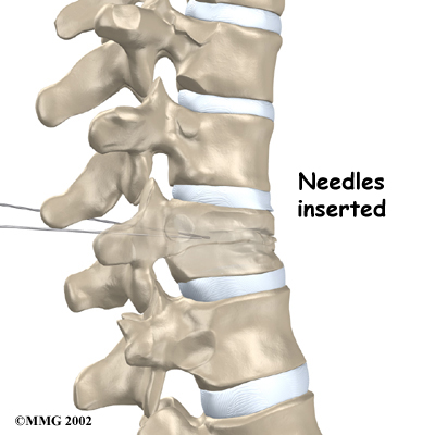 A fluoroscope is used to guide the needles. This is a special X-ray television camera adjusted above the patient's back that lets the surgeon see the patient's spine on a screen. Metal objects show up clearly on X-rays. The needles are easy for the surgeon to see on the fluoroscope screen. This helps the surgeon confirm that the needles reach the correct spot.