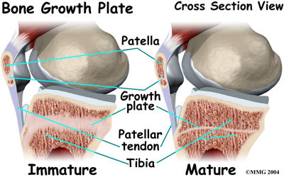 Sometimes the bone growth center at the bottom tip of the kneecap is affected instead of the patellar tendon itself. This condition is known as Sinding-Larsen-Johansson disorder. It is mostly likely to occur during growth spurts. Disruption within the developing bone in the bottom tip of the kneecap also produces pain and tenderness in the front of the knee.