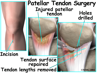 The skin is opened to expose the patellar tendon. Next, the surgeon carefully peels damaged tissue off the surface of the tendon. Three to five thin lengths of the tendon are removed. In some cases, small drill holes are made in the bottom tip of the patella. This drilling causes a small amount of bleeding, which signals the body to begin to heal the area. The surgeon also removes any damaged tissue nearby the area before completing the operation by stitching up the skin and wrapping the area with a bandage.