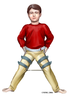 In the past, surgeons have tried to hold the hip in the best position where the femoral head was molded by the acetabulum using many different casts and braces. The most common way of doing this today is the Scottish Rite Orthosis. This brace fits around the waist and thighs and has hinges at the hip joints. The brace allows the child to walk and play while it holds the hip joint in the best position for containment. Your doctor may prescribe this for your child once they leave the hospital. Your physical therapist will help your child learn to safely use crutches or a walker/frame if they are needed while in the brace.