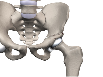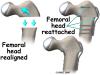 Realignment of the femur is called a femoral osteotomy. This procedure changes the angle of the femoral neck so that the femoral head points more towards the socket. To perform this procedure, an incision is made in the side of the thigh. The bone of the femur is cut and realigned in a new position. A large metal plate and screws are then inserted to hold the bones in the new position until the bone has healed. The plate and screws may need to be removed once the bone has healed.