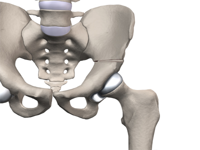 The hip joint is where the thighbone (femur) connects to the pelvis. The joint is made up of two parts. The upper end of the femur is shaped like a ball. It is called the femoral head. The femoral head fits into a socket in the pelvis called the acetabulum. This ball and socket joint is what allows us to move our leg in many directions in relation to our body.