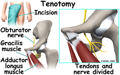 Sometimes, adequate motion cannot be regained with traction and physical therapy alone, therefore in some cases, surgery will be required to obtain adequate containment. If the condition is longstanding, the muscles may have contracted or shrunk and cannot be stretched back out. To help restore motion, the surgeon may recommend a tenotomy of the contracted muscles. When a tenotomy is performed, the tendon of the muscle that is overly tight is cut and lengthened. This is a simple procedure that requires only a small incision. The tendon eventually scars down in the lengthened position, and no functional loss is noticeable.