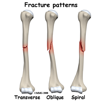 There are different patterns of fracture depending on the mechanism of injury, but all involve a complete break around the entire circumference of the tubular bone. In adults it is virtually impossible to break the tube on one side only. This is significant because it means that any break of the humerus interrupts the function of the arm. You cannot lift up or rotate the arm below the break.
