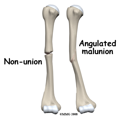 Unless a fracture has been operated on and fixed, it is rare for the alignment of the fracture to be exactly right. Most often this is acceptable but the angulation or rotation at the fracture site can be great enough to cause problems. This would result in inability to lift the arm fully out to the side or fully forward. Because the arm can rotate a lot these restrictions of motion may not be apparent and so may not need to be corrected. However, if they are significant the malunion can be corrected by surgery. This would normally involve an operation to cut the bone and fix it in the corrected position. This amounts to a new fracture with the same long period of healing so correcting a malunion is not undertaken lightly. If the malunion is treated by surgery one would expect healing and recovery of full range of motion and function.