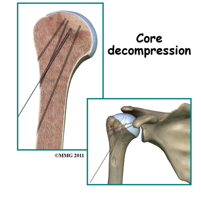 Core decompression is done by drilling small holes from the healthy bone to the area of necrosis in the humeral head. This creates channels that allow new blood vessels to grow into the necrotic area. The surgeon uses a special type of X-ray called fluoroscopy to guide the placement of the pins used to drill the holes. Removing some of the dead bone also causes bleeding into the region of necrotic bone and stimulates new bone growth. Many patients report immediate pain relief from this procedure.