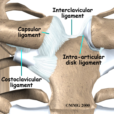 The connects your clavicle (collarbone) to your sternum, which is the large bone down the middle of your chest. This attachment is the only bony joint linking the bones of the arm and shoulder to the main part of the skeleton.