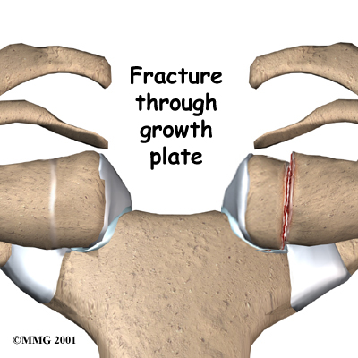 Injuries to the growth plate of the clavicle usually heal without treatment. The growth plate is a section of cartilage near the end of the clavicle where bone growth occurs. Only rare cases require surgery. In younger children, the growth of the bone will remodel the fractured bone. Remodeling actually causes the collarbone to straighten as the child grows. In young adults, there is less of this straightening effect because their bone growth is nearly complete.