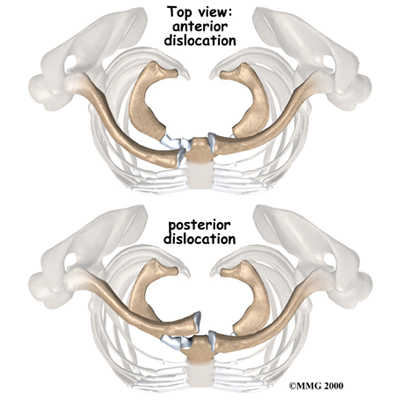 When the SC joint is dislocated, it is usually an anterior dislocation. This means that the clavicle is pushed forward, in front of the sternum. Dislocating in the opposite direction is less common because the ligaments on the back side of the joint are so strong.