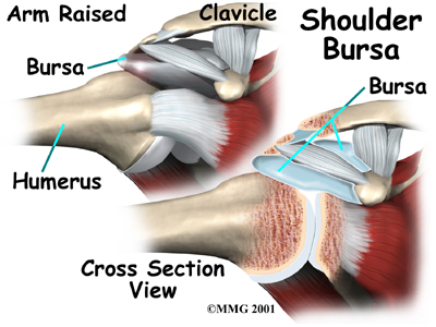 The part of the scapula that connects to the lateral shoulder is called the acromion. A bursa is located between the acromion and the rotator cuff tendons. A bursa is a lubricated sac of tissue that cuts down on the friction between two moving parts. Bursae are located all over the body where tissues must rub against each other. In this case, the bursa protects the acromion and the rotator cuff from grinding directly against each other.