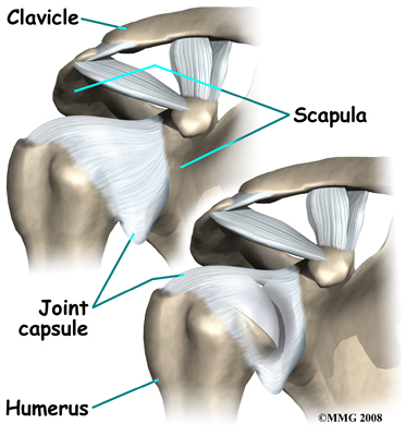 A watertight sac called the joint capsule surrounds the shoulder joint. The joint capsule holds fluids that lubricate the joint. The walls of the joint capsule are made up of ligaments. Ligaments are connective tissues that attach bones to bones. The joint capsule has a considerable amount of slack (loose tissue), so that the shoulder is unrestricted as it moves through its large range of motion.