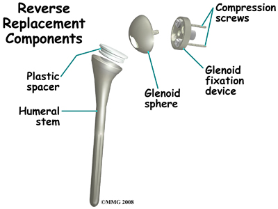 The reverse shoulder prosthesis (artificial joint) is made up of two parts. The humeral component replaces the humeral head, or the ball of the joint. The glenoid component replaces the socket of the shoulder, which is actually part of the scapula.