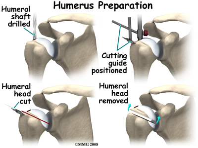 During the surgery, the humerus is prepared by cutting off the deformed humeral head and reaming the canal to allow for insertion of the humeral stem. The glenoid is reamed to create a bone tunnel, and flattened to seat the glenoid base plate. In patients with weak bone, fractures can occur during this part of the procedure that may require restricted activity after the surgery while the fracture heals.
