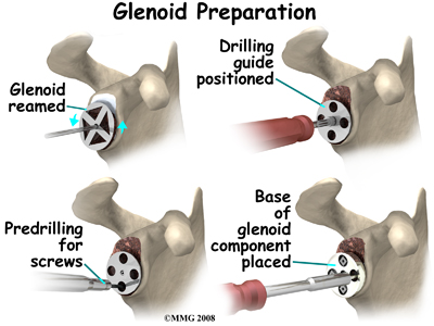The glenoid will be replaced with a ball of metal. The arthritic glenoid surface is prepared by grinding away any remaining cartilage and flattening the surface. This is done with an instrument called a reamer. The surgeon usually uses the reamer to drill holes into the bone of the scapula and to flatten the deformed glenoid surface so the base plate rests on a smooth, flat surface. This is where the stem of the glenoid component is anchored.