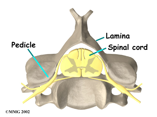 This is formed by two sets of bones. One set, the pedicle bones, attaches to the back of each vertebral body. On the other end, each pedicle bone connects with a lamina bone. The lamina bones form a protective roof over the back of the spinal cord. When the vertebra bones are stacked on top of each other, the bony rings forms a long bony tube that surrounds and protects the spinal cord as it passes through the spine.