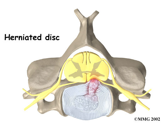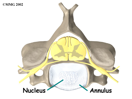 An intervertebral disc fits between each vertebral body and provides a space between the spine bones. The disc works like a shock absorber. It protects the spine against the daily pull of gravity. It also protects the spine during activities that put strong force on the spine, such as jumping, running, and lifting.