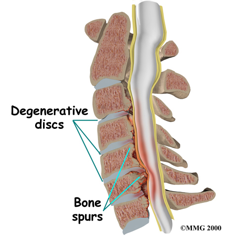 Degeneration is the most common cause of spinal stenosis. Wear and tear on the spine from aging and from repeated stress and strain can cause many problems in the cervical spine. The intervertebral disc can begin to collapse, shrinking the space between vertebrae. Bone spurs may form that protrude into the spinal canal and reduce the space available to the spinal cord. The ligaments that hold the vertebrae together may become thicker and can also push into the spinal canal. All of these conditions .