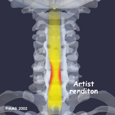 The spinal cord is a column of nerve tissue protected by a bony tube in the spinal column. Conditions that narrow the space in this tube put the spinal cord at risk of getting squeezed. This narrowing in the spinal column of the neck is called cervical spinal stenosis, or cervical stenosis. Pressure against the spinal cord as a result of spinal stenosis causes myelopathy, a condition that demands medical attention. Myelopathy can cause problems with the bowels and bladder, change the way you walk, and affect your ability to use your fingers and hands.