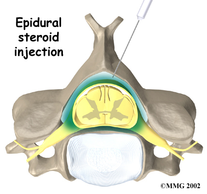 Some patients are given an (ESI). The injection is given in a part of the spinal canal called the epidural space. This is the area between the dura (the material that covers the spinal cord) and the spinal column. It is thought that injecting steroid medication into this space fights inflammation around the nerves and discs. This can reduce the swelling and give the spinal cord more room.