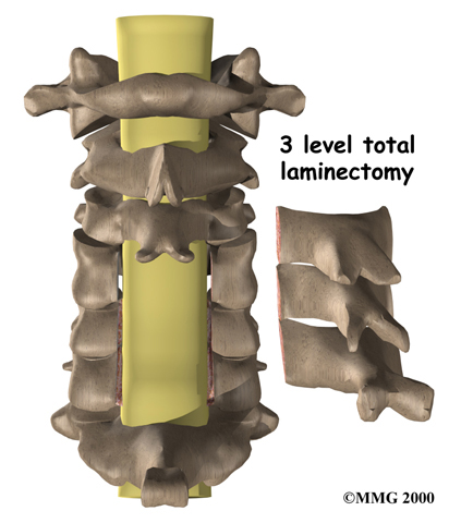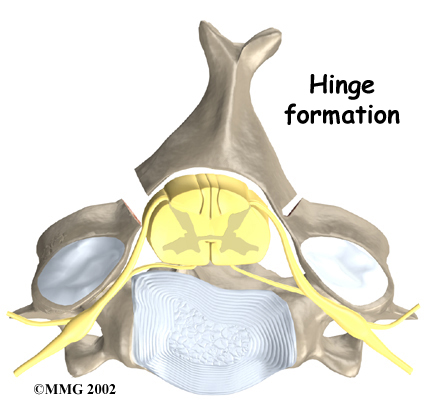 Some surgeons completely remove the entire lamina bone, called . Others prefer to keep the lamina in place by forming a hinge on one edge of the bone. This is formed by cutting partially through the lamina on one side. A second cut is made all the way through the lamina on the other side. This edge is then lifted away from the spinal cord, and the other edge acts like a hinge. The hinged side eventually forms a bone union, which holds the opposite side open and keeps pressure off the spinal cord.