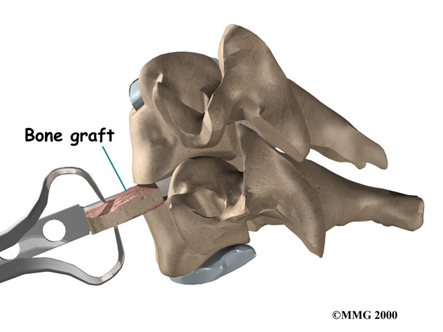 A fusion surgery joins two or more bones into one solid bone. Fusion of the neck bones is most often done through the front of the neck. The surgeon takes out the intervertebral disc (discectomy) between two vertebrae. A layer of bone is shaved off the flat surfaces of the two vertebrae to be fused. This causes the surfaces to bleed and stimulates the bone to heal. (This is similar to the way two sides of a fractured bone begin to heal.) A is grafted from the top part of the pelvis bone and inserted into the space where the disc was taken out. This separates the two vertebra bones, taking pressure off the spinal cord. As the bone graft heals in place, the vertebral bones fuse together into one solid bone.