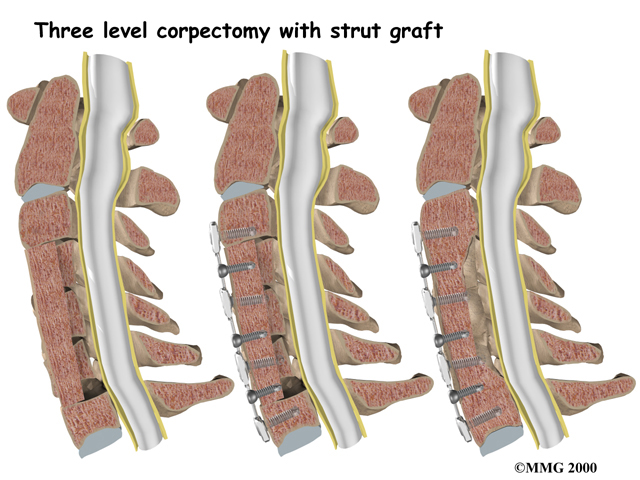 A relieves pressure over a large part of the spinal cord. In this procedure, the surgeon takes off the front part of the spinal column and removes several vertebral bodies. The spaces are then filled with bone graft material. Metal plates and screws are generally used to hold the spine in place while it heals. A corpectomy is used in cases of severe spinal stenosis.