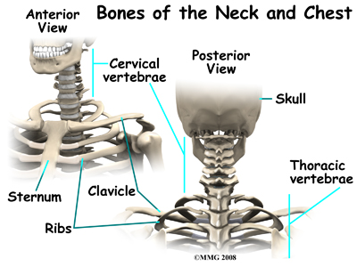 The vertebral column is divided into three distinct portions. The cervical, or neck portion attaches to the base of the skull at the upper end. The lower end of the cervical portion connects with the thoracic spine. There are seven cervical vertebrae.