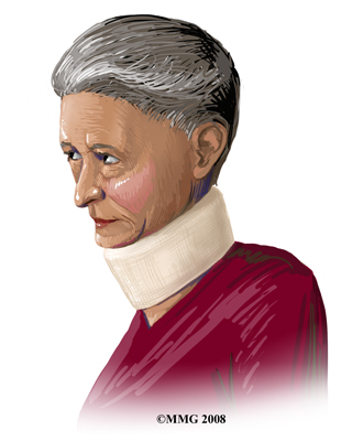 The collar can partially correct the chin-on-chest deformity. This improves forward gaze and activities of daily living. It also can help prevent contractures of the neck in a fixed flexed posture. However, it can be uncomfortable and cause sores under the chin. In these cases, other options can be suggested to prevent chin discomfort.