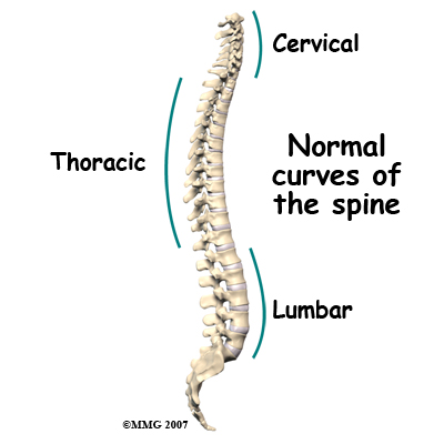 When viewed from the side, the spine forms three curves: The neck, (called the cervical spine) curves slightly inward, the thoracic spine curves outward, and the low back (called the lumbar spine,) like the cervical spine, also curves inward. When viewed from the back, the vertebrae form a straight column keeping the head centered over the body.