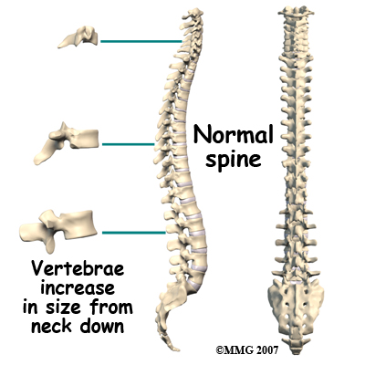 Each vertebra is made of the same parts.  A round block of bone, called the vertebral body, forms the main section of each vertebra. Each vertebra increases slightly in size from the neck down. The increased size helps balance and support the larger muscles that connect to the lower parts of the spine. Each section of vertebrae, however, the cervical, thoracic, and lumbar, are anatomically a bit different from each other in order to accommodate each area’s particular function for the body.