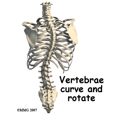 The most common curve in infantile idiopathic scoliosis is in the low thoracic region. Single curves are almost always in the thoracic region with variable amounts of vertebral rotation. As the vertebrae rotate, the attached ribs shift causing a noticeable rib bump or hump, as it is called, on one side of the spine. This hump is most obvious when the child is bent forward at the waist.