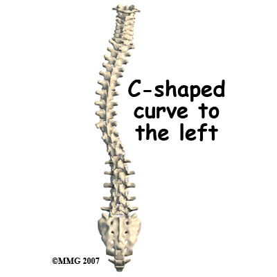 Any part of the spine can be affected by scoliosis, however, most often the thoracic and then lumbar spines are affected. The vertebrae curve to one side and may rotate, which makes the waist, hips, or shoulders appear uneven.  At first, a C-shaped curve may develop causing the shoulders and hips to tilt down on one side. In an effort to keep the head in the middle, the spine may compensate by curving the lower part of the spine in the other direction, forming an S-curve.