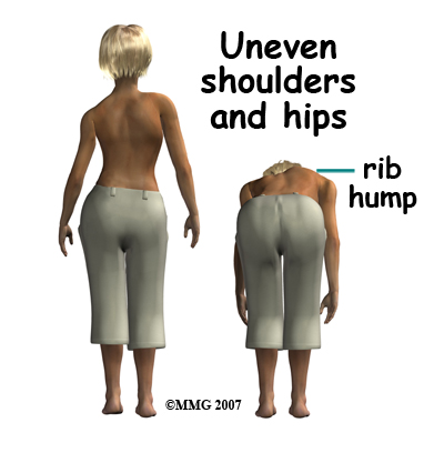 As a result, the shoulders and hips may be uneven, causing one shirtsleeve or pant leg to seem shorter than the other. Often there is rotation of the vertebrae causing an uneven waist so that a pair of pants or skirt twists to one side.