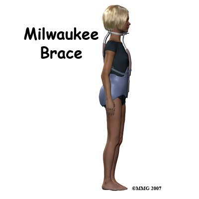 The Milwaukee Brace is a corrective brace used with children and adolescents who have scoliosis. It has a pelvic girdle, two posterior uprights, one anterior upright, and a ring around the base of the skull that also supports the lower jaw. Originally made of leather and metal, it has been revised now and is constructed out of rigid plastic with metal uprights. Pads with straps attached to the frame are used to apply corrective forces.