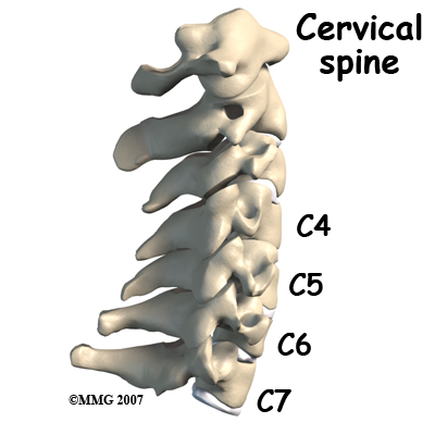 Disc replacement typically occurs at cervical spine levels C4-5, C5-6, or C6-7. The first seven vertebrae make up the cervical spine. Doctors often refer to these vertebrae as C1 to C7. The cervical spine starts where the top vertebra (C1) connects to the bottom of the skull. The cervical spine curves slightly inward and ends where C7 joins the top of the thoracic spine (the chest area) at the first thoracic vertebra, T1.