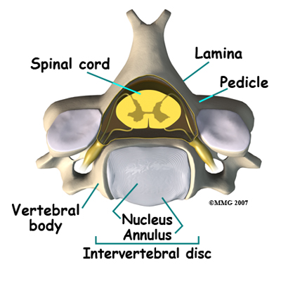 Each vertebra is made of the same parts. The main section of each cervical vertebrae, from C2 to C7, is formed by a round block of bone, called the. A bony ring attaches to the back of the vertebral body. This ring has two parts. Two pedicles connect directly to the back of the vertebral body. Two lamina bones join the pedicles to complete the ring. The lamina bones form the outer rim of the bony ring. When the vertebrae are stacked on top of each other, the bony rings form a hollow tube that surrounds the spinal cord. The laminae provide a protective wall around the spinal cord.