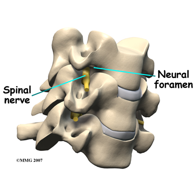 On the left and right side of each vertebra is a small tunnel called a neural foramen. (Foramina is the plural term.) The two nerves that leave the spine at each vertebra go through the foramina, one on the left and one on the right. The intervertebral disc sits directly in front of the opening. A bulged or herniated disc can narrow the opening and put pressure on the nerve. A facet joint sits behind the foramen. Bone spurs that form on the facet joint can project into the tunnel, narrowing the hole and pinching the nerve.