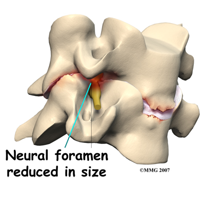 Shrinking disc height also reduces the size of the neural foramina, the openings between each vertebral pair where the nerve roots leave the spinal column. The arthritis also results in the development of bone spurs that may protrude into these openings, further narrowing the space that the nerves have to exit the spinal canal. The nerve roots can end up getting squeezed where they pass through the neural foramina.