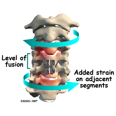 The fusion procedure usually involves the use of hardware, such as screws, plates, or cages to keep the bones from moving. Fusion restricts movement in the problem area, but it creates greater strain on the healthy spinal segments above and below. The added strain may eventually cause these segments to wear out. This is called adjacent-segment degeneration.